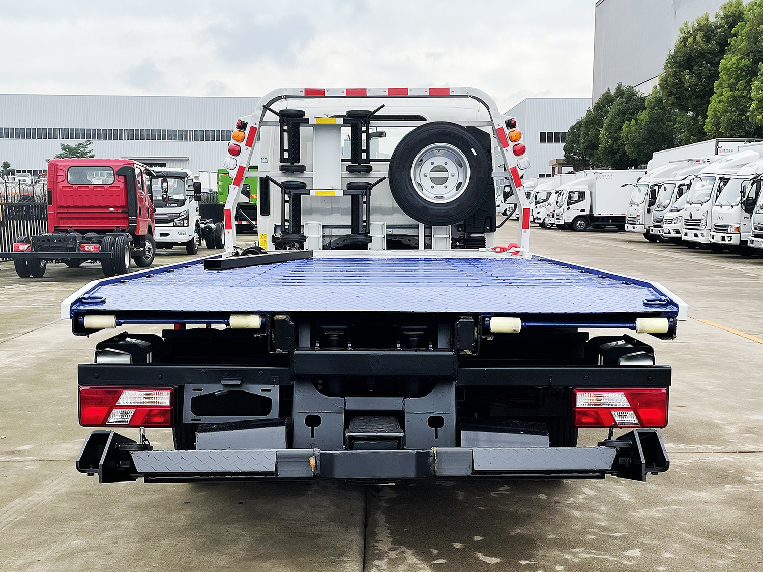 藍牌上裝配置:沖壓式伸縮板,液壓翻轉常規托舉裝置,平板可承載4噸以內重物,主板長4~4.2米,折疊、伸縮或翻轉部分1~1.35米,平板總長可達5.1~5.35米,雙側聯動操作裝置,后工作燈三只,1個40KN液壓絞盤(25米鋼絲繩)一個工具箱一個洗手箱,配兩個**小車,四根新式綁帶,鏈鉤1條,L型抱胎架一對,托叉和托叉座各一對,帶2噸后托臂。